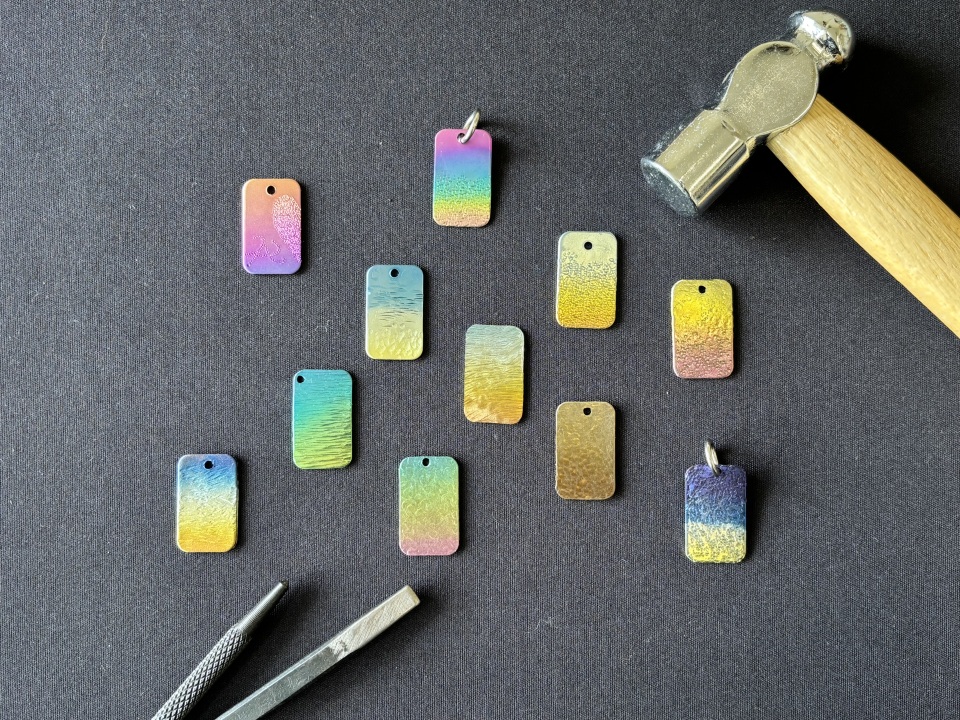 チタン製の板をいろんな形の金鎚で叩いて好みの模様をつけていきます。